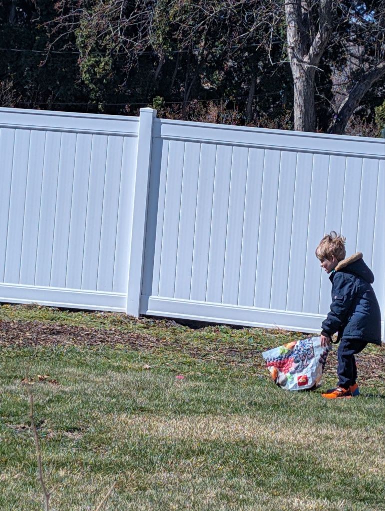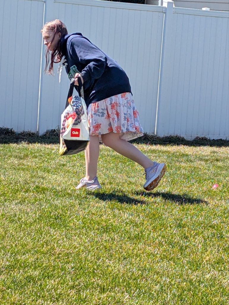 Easter Sunday, Dad was feeling too weak to go to church, so we skipped. D16 hid some plastic eggs in the yard, and then IL7 did a hunt. Everyone got a book from the Easter Bunny, too. IL7 got “BFG” by Roald Dahl. I got a biography of Benjamin Franklin. M13 got a history graphic novel. In the evening, I cooked a ham dinner.
