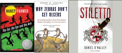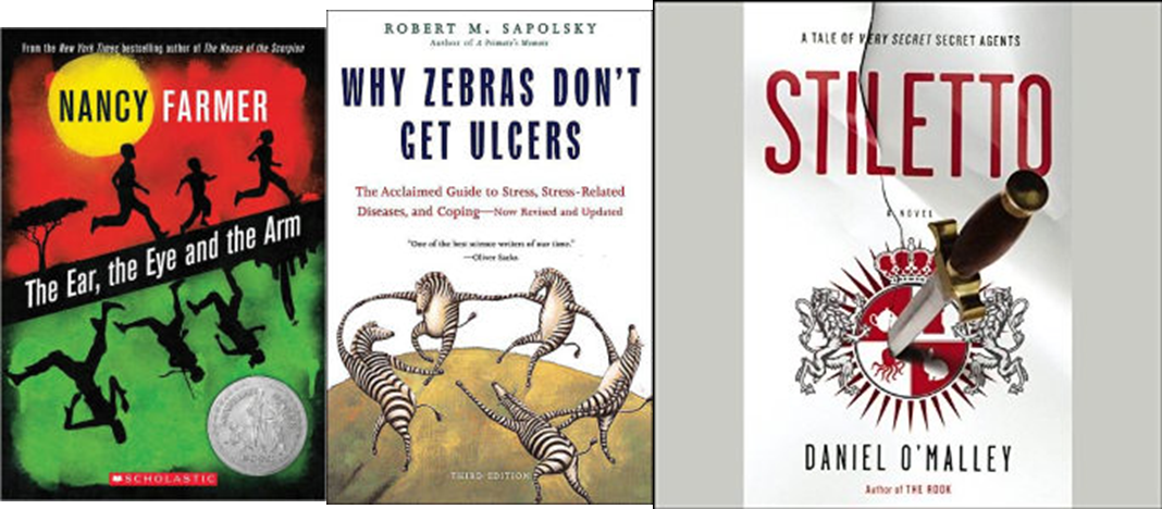 I’m currently reading: The Ear, the Eye, and The Arm, by Nancy Farmer as my fiction (for fun book); Stiletto, by Daniel O’Malley as my audiobook (book club book); and Why Zebras Don’t Get Ulcers, by Robert M. Sapolsky for my fiction (for fun book).