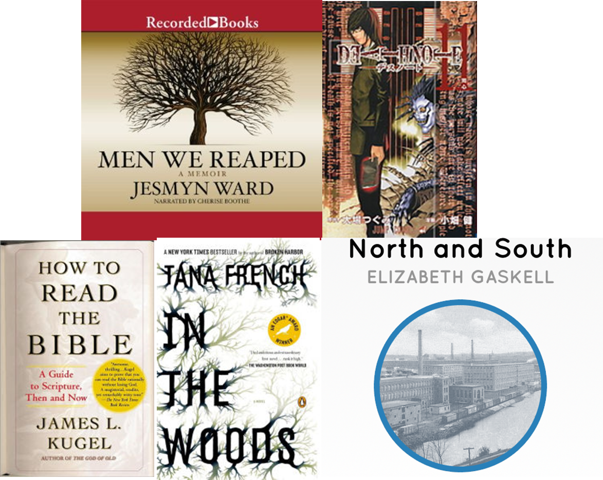 I’m currently reading Men We Reaped, by Jesmyn Ward with the Social Justice Book Club; Death Note, by Tsugumi Ohba; In the Woods, by Tana French; How to Read the Bible, by James Kugel; and North and South, by Elizabeth Gaskell as my serial read.