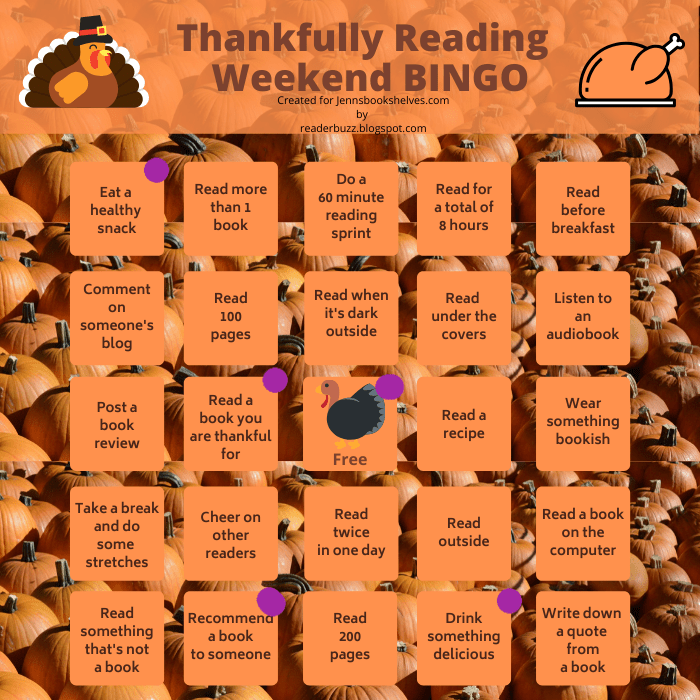 Deb at Readerbuzz is hosting an Thanksfully Reading Weekend BINGO, which I’m going to participate in. There’s a purple dot on all the stuff I’ve done so far, but I hope to get a lot more done through Sunday.