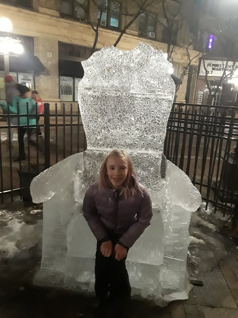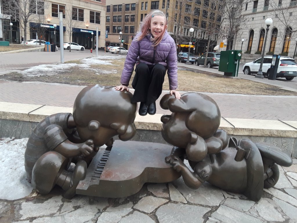 D had her third choir concert of the year. It was REALLY good. And she only looked like she was going to faint once. And she rallied well. Up there is a picture of her sitting on an ice throne in Downtown St Paul after her dress rehearsal. We also got some pictures with Charlie Brown Statues.