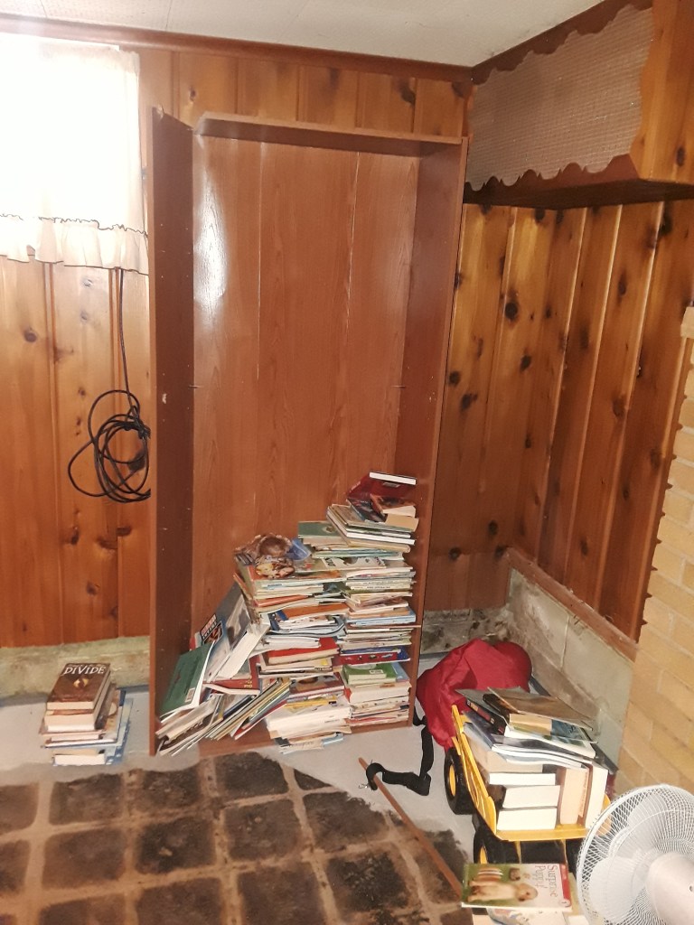 I’m working on cleaning out my parents’ basement so that a contractor can fix the place up. Dad will probably have to sell the house to afford memory care for mom, so we’re trying to get it into sellable condition. I started with a bookcase that’s falling apart in a corner. Not sure what happened to this one, but it looks like it’s been through the ringer. Some of the books were for young children, and I saved those for IL-17mo. The rest are going to Half Price Books. However, I found out that HPB isn’t buying books at the moment, so I had to store a bunch in my garage. Partly because the point was to get things out of dad’s basement, and partly because J-16 (who is living with my parents at the moment) “cleans” by shoving everyone else’s stuff somewhere out of his way. I suspect he’s the one who did a number on this bookcase: