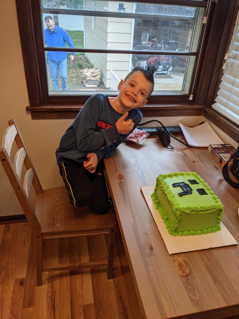 M9 had a small birthday party this Sunday. He got a tricycle/scooter/balance bike, some Lego sets, some books, a puzzle, and a gift card to Game Stop. He had 2 friends over, and D11 had one friend over. The party theme was Minecraft.