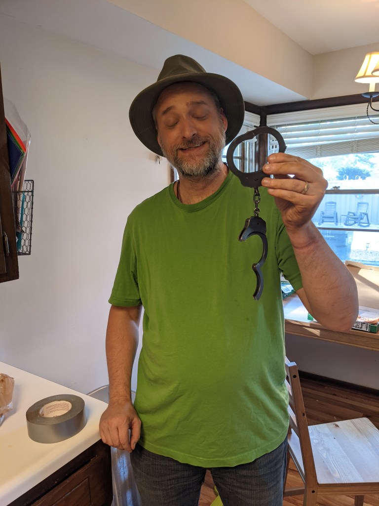 Aaron started LARPing again, and part of hos costume included handcuffs. He checked that the key worked before-hand, and then he put the cuffs on his wrist, when the key stopped working. I wanted to go to the store and buy some bolt cutters, but he insisted on sawing them off. He only broke the kin a little.
