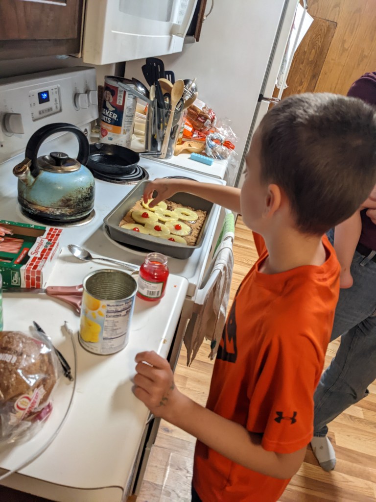 Wednesday M10 tried eating pineapple upside-down cake and maraschino cherries as his palate-expanding foods in therapy. He spat out both after the first bite. Next time is kale, cabbage, and mashed potatoes. D12 and I worked on her book report. Then I went to work.
