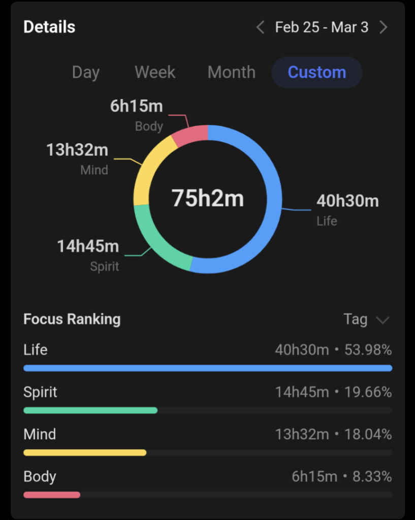 I have separated my productivity time into life, body, spirit and mind. My goal is for the month of March is 60 hours mind, 12 hours body, 80 hours spirit. I don’t have a life goal, because the purpose of this exercise is to spend less time on life, and more time on personal development. I consider all structured necessary productivity to be life.
