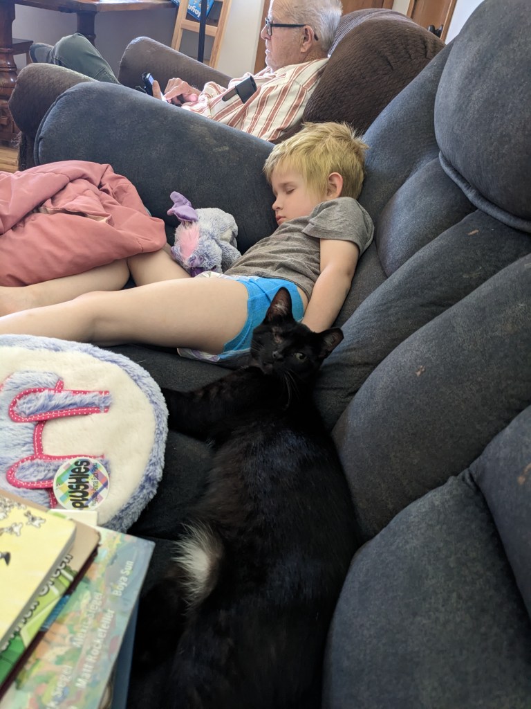 Sunday was our first family day since baseball started. They didn’t have a Sunday game because of the holiday. IL4 fell asleep (his new ADHD med is doping him up, but that’s hopefully temporary), so we watched Psych for a few episodes. We should have played a board game, but I was tired after a couple hours at the laundromat washing our poopy comforters. We also had a flat tire (D13 noticed).