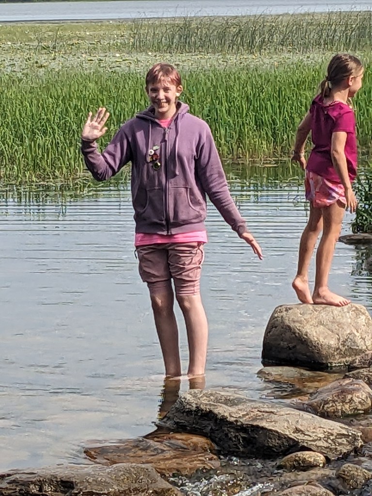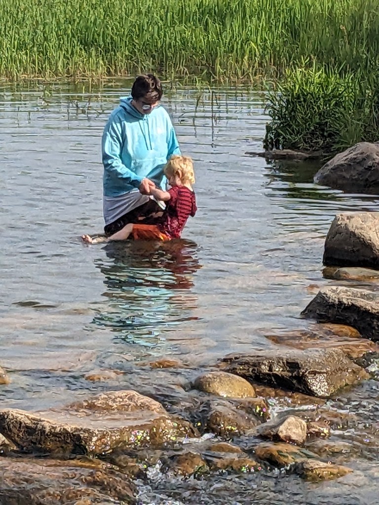 D13 managed to stay dry during the wading part, but I slipped and fell in twice trying to keep up with IL4, and because IL4 was holding on to me as he made the precariously large steps between the dry stones, I pulled him in on top of me both times. When we had crossed on the rocks for the third time, there was a woman standing on the other end laughing at my plight (in a friendly way). I told her “This is why you have kids at 20 instead of 40,” and she pointed to a 6-ish year old girl and said she’d had her at 54. 😱 She totally had me beat. IL4 and I finally gave up and waded fully in to both the Mississippi and Lake Itasca sides.