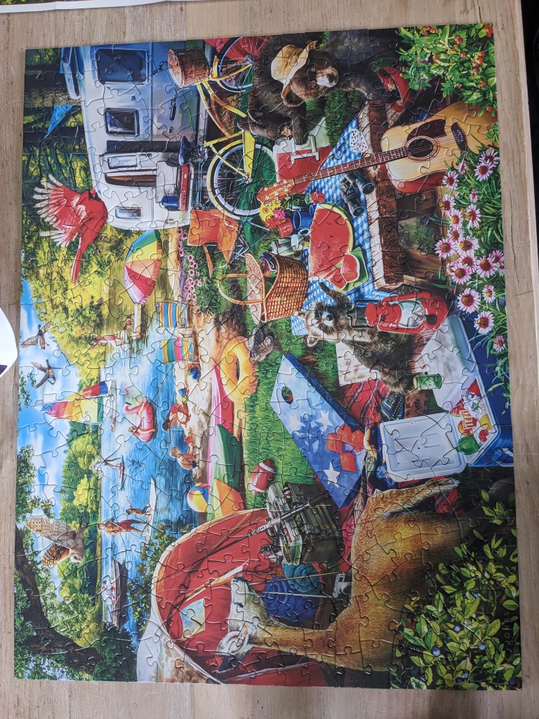 Because IL4 and I both were soaked (more so IL4, because he’s shorter), we went back to the cabin after that. I took a nap, IL4 watched YouTube on the phone (but only after he made two pots of coffee and we pried the coffee maker from his desperately clinging hands to prevent a third and final pot being spilled all over the cabin), D13 put together a puzzle, and Aaron read.