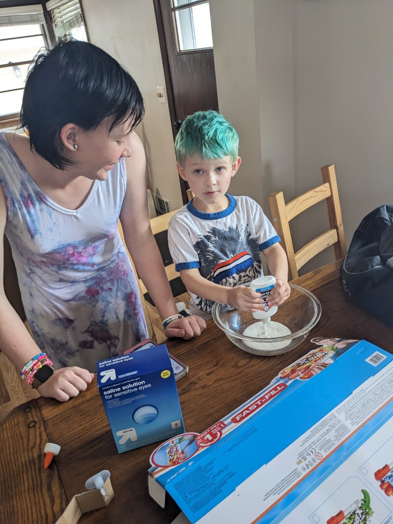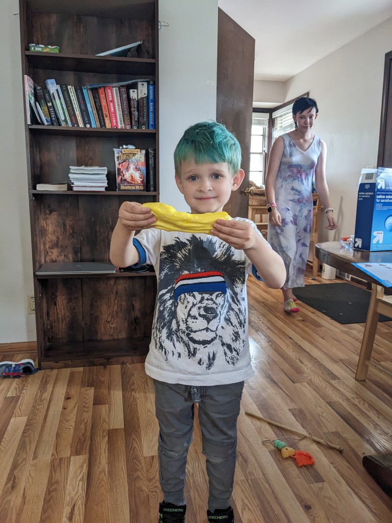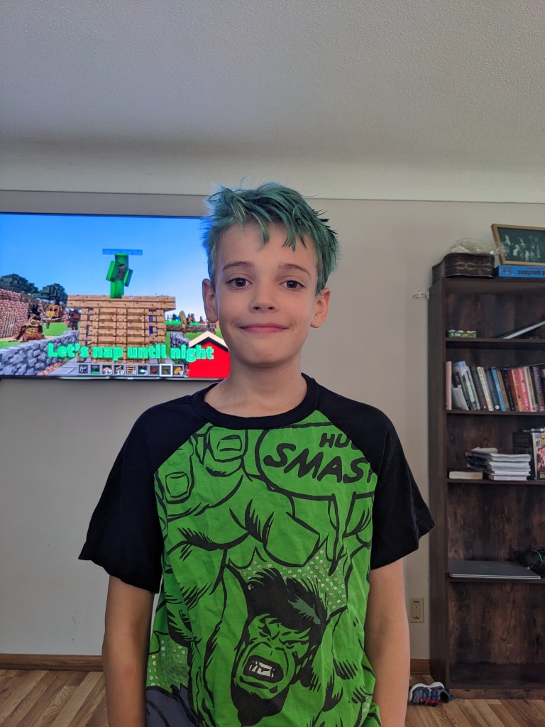 Monday we had two appointments – one for me, one for D13. Then D13 and IL4 made slime and chocolate chip cookies, while I dyed M11’s hair green. IL4 slept through his penultimate soccer game (the one on Wednesday will likely be cancelled due to heat, so it was probably the ultimate soccer game). I coached anyway, and picked up IL4’s participation medal. M11 had Boy Scouts and worked on the Signs and Signals merit badge.