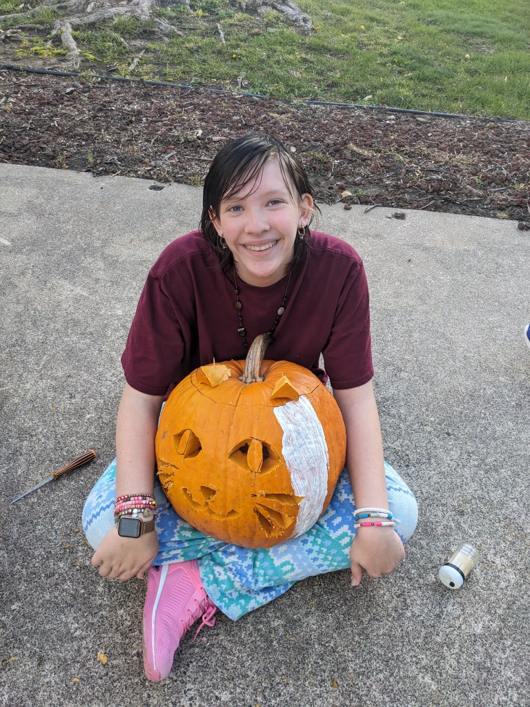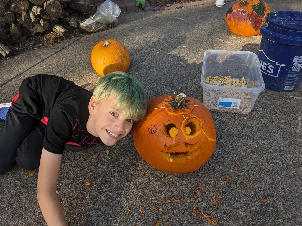 Afterwards, D13, M11, IL4, Aaron and I carved pumpkins. J19 was excited to do so, too, but then wandered off and didn’t carve his. His loss. 🤷♀️
