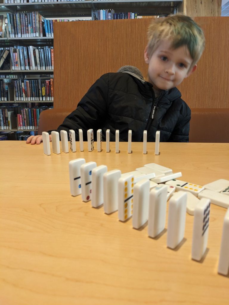 Saturday was a good day. I started the day making sausage stew for the week’s lunches for myself and Aaron. IL5, dad, and I headed to the library for a while. We picked out books, played with toys, and set up dominos. Aaron went to his board game group and D14, IL5, dad, and I went to Olive Garden. Aaron and D14 started a jigsaw puzzle hour at night during the time I sometimes read to her, so we had to compromise and say Aaron gets her 3 days a week and I get her 3 days a week and Aaron and I watch Supernatural one day a week. (The Supernatural was already a thing, but we often don’t get to it.) Anyway, Saturday was puzzle day.
