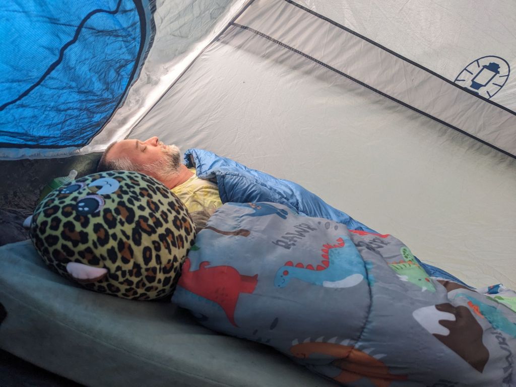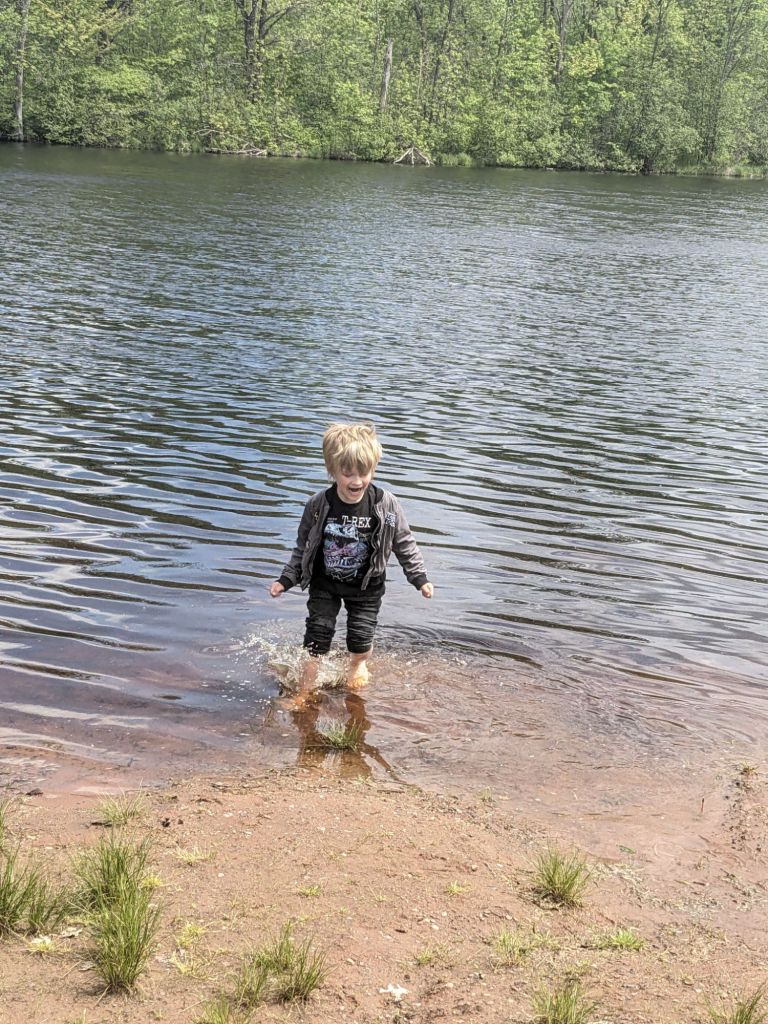 After the half-successful hike, we went to a playground and to the lake to wade. Upon returning to the campsite, we relaxed in the tent during some rain, and called it a night after another fire and some brats in the evening.