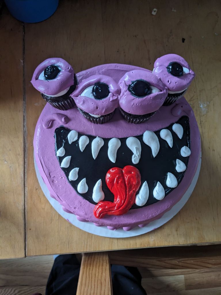 M12’s birthday celebration went well. The cake was meant to be a beholder, but the cake bakers didn’t get my instructions quite right. It was still pretty awesome-looking. M12 seemed pleased with the boardgame he got from my dad and with the toy that IL5 pulled out of his own toy chest and wrapped for M12.