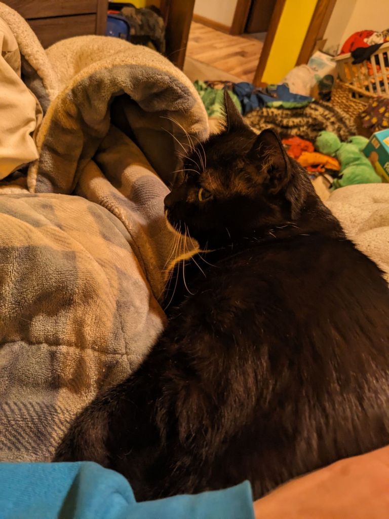 In the evening, M12 and D15 left with their mom and IL6 and I went to a party at his school. He didn’t find the party very interesting, so we came home and sat in his room for the rest of the evening. To my shock and awe, Hero came and sat on my lap for a half hour. I don’t recall her ever, in almost 8 years of life, sitting on someone’s lap. I got photographic evidence.