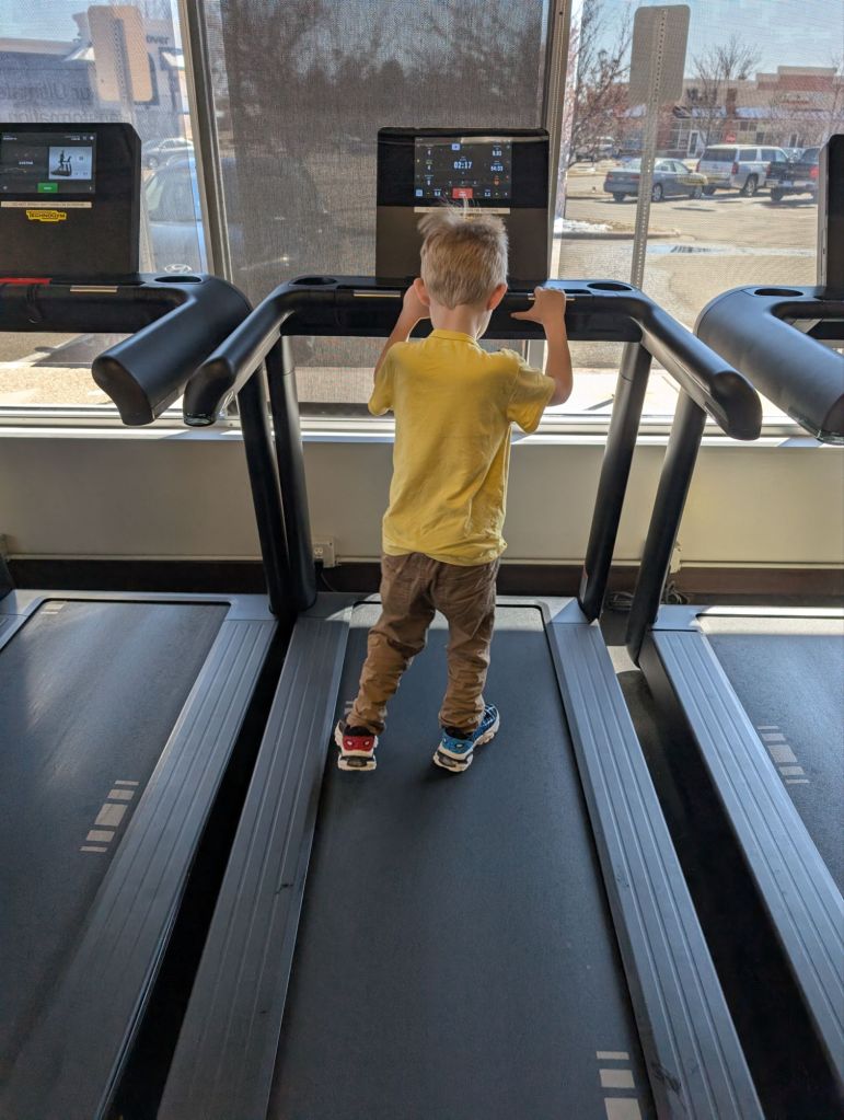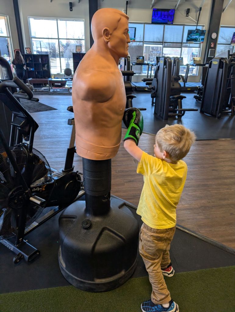 When I took dad to the gym, I intended on working out, but instead decided to take IL6 to the gym. He really enjoyed seeing the equipment. He ran on the treadmill, lifted weights, and punched the dummy.