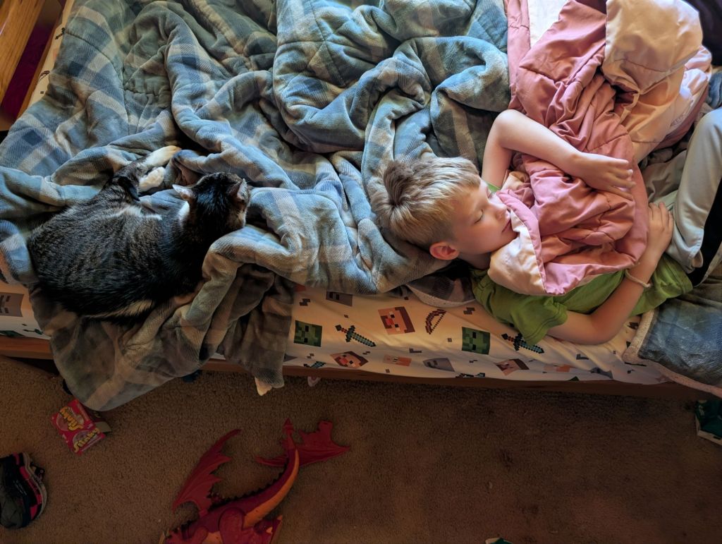 Wednesday was frustrating. I discovered I’d locked my keys in the car when attempting to leave work and waited 3 hours for AAA to rescue me. I had to reschedule an appointment. Then, after eating for the first time that day (at 1pm), I dropped dad off at an appointment and went to the music store to get M12’s trombone fixed. After that, I went to pick up a form from M12’s doctor. But because of traffic and pouring rain, and very confusing construction, I missed my exit and misplaced myself trying to get back to where I wanted to be. It added 30ish minutes to my drive. I took the rest of the day off. IL6 played in his sandbox and I chatted with family.